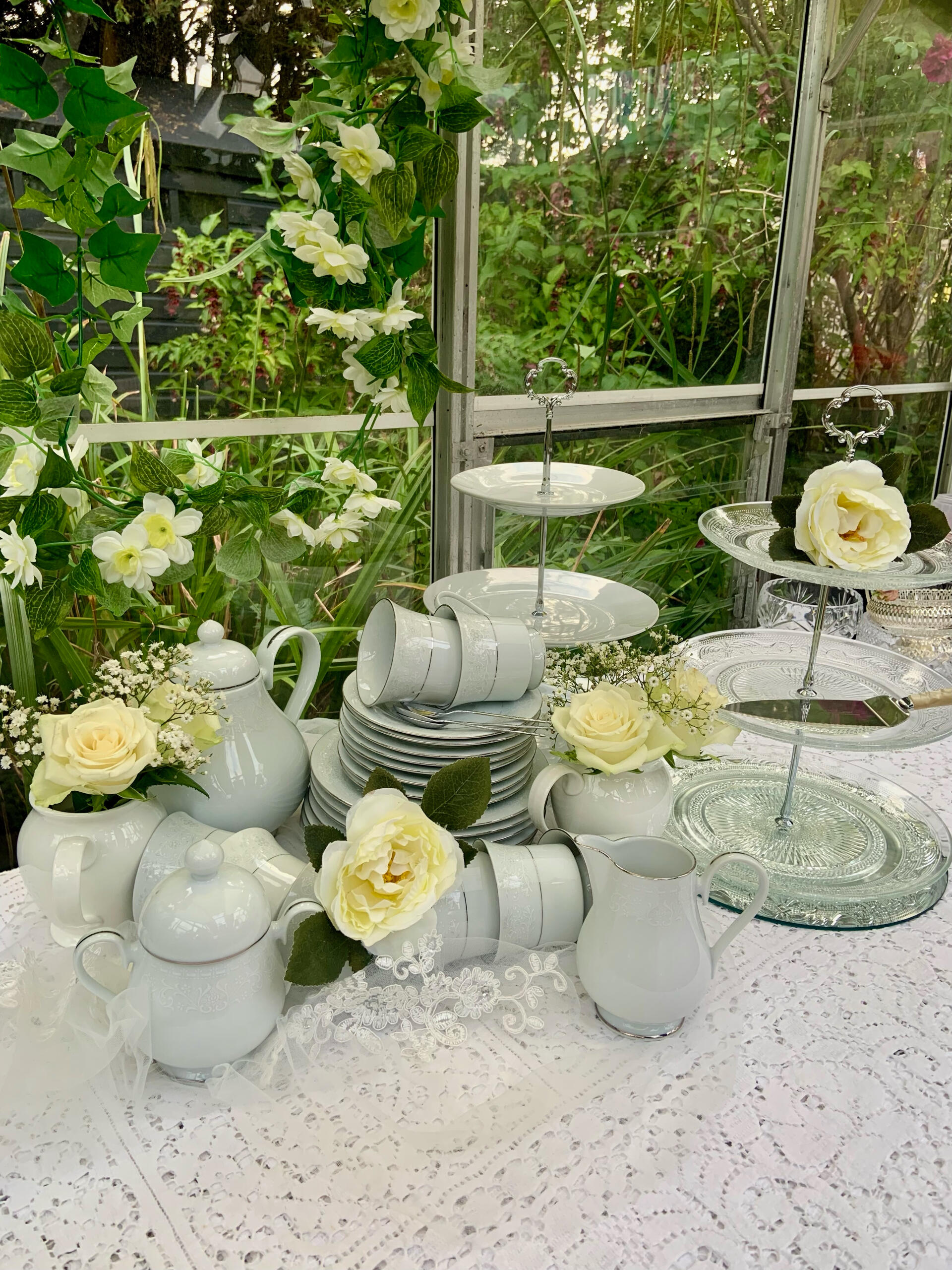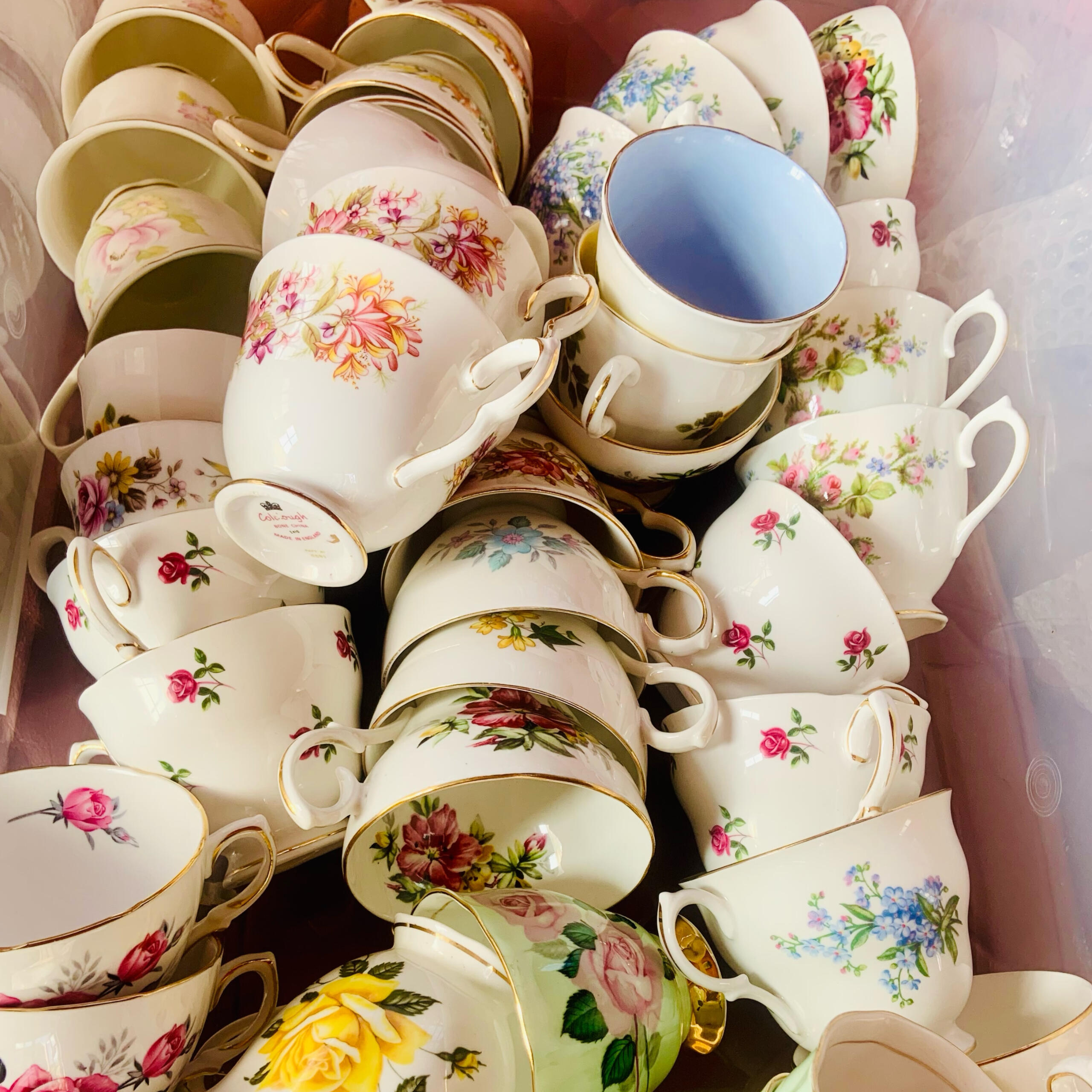 Our pretty vintage china collection is available to hire. Gorgeous pieces of matched and mismatched china to enhance and occasion. Afternoon tea china packages are priced from £4.00 per head.You will be supplied with the following (per person):1 cup, 1 saucer and 1 side plate .Between 4 covers you will also recieve:A teapot, milk jug, sugar bowl, 2 tier cake stand, cake/sandwich plate.Extra items are available upon request.Our china is supplied in boxes, safely packed with cleaning instructions. All we ask is once you have finished with the china, you throw away any liquids, scrape the plates and return them into the packaging boxes.